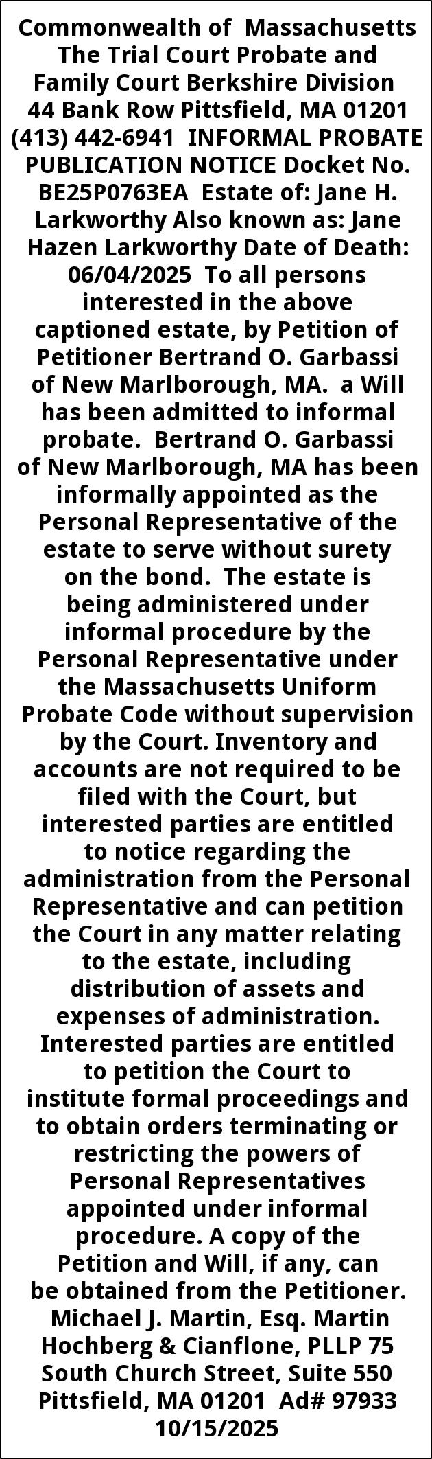 Commonwealth of Massachusetts The Trial Court Probate and Family Court Berkshire Division 44 Bank Row Pittsfield, MA 01201 (413) 442-6941 INFORMAL PROBATE PUBLICATION NOTICE Docket No. BE25P0763EA Estate of: Jane H. Larkworthy Also known as: Jane Hazen Larkworthy Date of Death: 06/04/2025 To all persons interested in the above captioned estate, by Petition of Petitioner Bertrand O. Garbassi of New Marlborough, MA. a Will has been admitted to informal probate. Bertrand O. Garbassi of New Marlborough, MA has been informally appointed as the Personal Representative of the estate to serve without surety on the bond. The estate is being administered under informal procedure by the Personal Representative under the Massachusetts Uniform Probate Code without supervision by the Court. Inventory and accounts are not required to be filed with the Court, but interested parties are entitled to notice regarding the administration from the Personal Representative and can petition the Court in any matter relating to the estate, including distribution of assets and expenses of administration. Interested parties are entitled to petition the Court to institute formal proceedings and to obtain orders terminating or restricting the powers of Personal Representatives appointed under informal procedure. A copy of the Petition and Will, if any, can be obtained from the Petitioner. Michael J. Martin, Esq. Martin Hochberg & Cianflone, PLLP 75 South Church Street, Suite 550 Pittsfield, MA 01201 Ad# 97933 10/15/2025