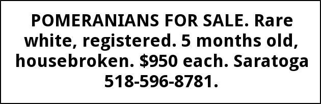 POMERANIANS FOR SALE. Rare white, registered. 5 months old, housebroken. $950 each. Saratoga 518-596-8781.