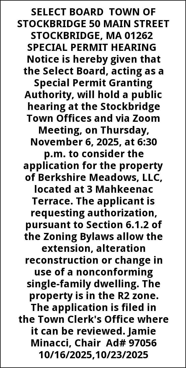SELECT BOARD TOWN OF STOCKBRIDGE 50 MAIN STREET STOCKBRIDGE, MA 01262 SPECIAL PERMIT HEARING Notice is hereby given that the Select Board, acting as a Special Permit Granting Authority, will hold a public hearing at the Stockbridge Town Offices and via Zoom Meeting, on Thursday, November 6, 2025, at 6:30 p.m. to consider the application for the property of Berkshire Meadows, LLC, located at 3 Mahkeenac Terrace. The applicant is requesting authorization, pursuant to Section 6.1.2 of the Zoning Bylaws allow the extension, alteration reconstruction or change in use of a nonconforming single-family dwelling. The property is in the R2 zone. The application is filed in the Town Clerk's Office where it can be reviewed. Jamie Minacci, Chair Ad# 97056 10/16/2025,10/23/2025