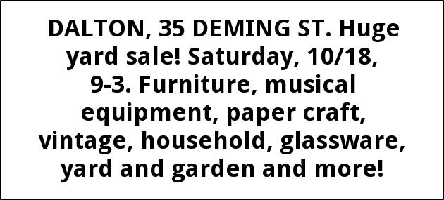 DALTON, 35 DEMING ST. Huge yard sale! Saturday, 10/18, 9-3. Furniture, musical equipment, paper craft, vintage, household, glassware, yard and garden and more!