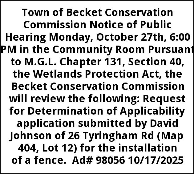 Town of Becket Conservation Commission Notice of Public Hearing Monday, October 27th, 6:00 PM in the Community Room Pursuant to M.G.L. Chapter 131, Section 40, the Wetlands Protection Act, the Becket Conservation Commission will review the following: Request for Determination of Applicability application submitted by David Johnson of 26 Tyringham Rd (Map 404, Lot 12) for the installation of a fence. Ad# 98056 10/17/2025