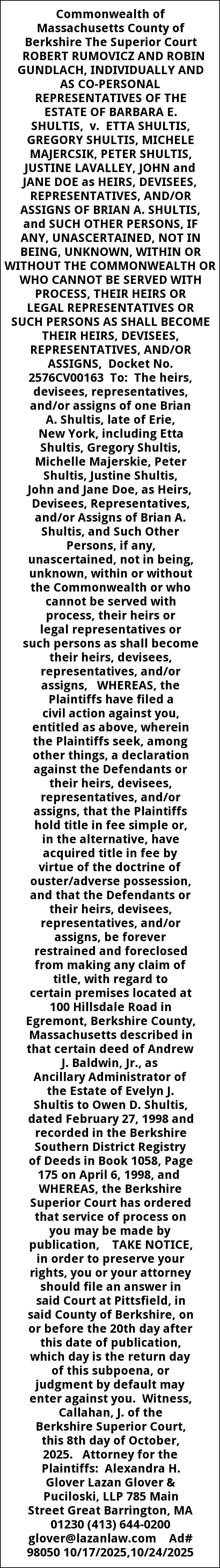 Commonwealth of Massachusetts County of Berkshire The Superior Court ROBERT RUMOVICZ AND ROBIN GUNDLACH, INDIVIDUALLY AND AS CO-PERSONAL REPRESENTATIVES OF THE ESTATE OF BARBARA E. SHULTIS, v. ETTA SHULTIS, GREGORY SHULTIS, MICHELE MAJERCSIK, PETER SHULTIS, JUSTINE LAVALLEY, JOHN and JANE DOE as HEIRS, DEVISEES, REPRESENTATIVES, AND/OR ASSIGNS OF BRIAN A. SHULTIS, and SUCH OTHER PERSONS, IF ANY, UNASCERTAINED, NOT IN BEING, UNKNOWN, WITHIN OR WITHOUT THE COMMONWEALTH OR WHO CANNOT BE SERVED WITH PROCESS, THEIR HEIRS OR LEGAL REPRESENTATIVES OR SUCH PERSONS AS SHALL BECOME THEIR HEIRS, DEVISEES, REPRESENTATIVES, AND/OR ASSIGNS, Docket No. 2576CV00163 To: The heirs, devisees, representatives, and/or assigns of one Brian A. Shultis, late of Erie, New York, including Etta Shultis, Gregory Shultis, Michelle Majerskie, Peter Shultis, Justine Shultis, John and Jane Doe, as Heirs, Devisees, Representatives, and/or Assigns of Brian A. Shultis, and Such Other Persons, if any, unascertained, not in being, unknown, within or without the Commonwealth or who cannot be served with process, their heirs or legal representatives or such persons as shall become their heirs, devisees, representatives, and/or assigns, WHEREAS, the Plaintiffs have filed a civil action against you, entitled as above, wherein the Plaintiffs seek, among other things, a declaration against the Defendants or their heirs, devisees, representatives, and/or assigns, that the Plaintiffs hold title in fee simple or, in the alternative, have acquired title in fee by virtue of the doctrine of ouster/adverse possession, and that the Defendants or their heirs, devisees, representatives, and/or assigns, be forever restrained and foreclosed from making any claim of title, with regard to certain premises located at 100 Hillsdale Road in Egremont, Berkshire County, Massachusetts described in that certain deed of Andrew J. Baldwin, Jr., as Ancillary Administrator of the Estate of Evelyn J. Shultis to Owen D. Shultis, dated February 27, 1998 and recorded in the Berkshire Southern District Registry of Deeds in Book 1058, Page 175 on April 6, 1998, and WHEREAS, the Berkshire Superior Court has ordered that service of process on you may be made by publication, TAKE NOTICE, in order to preserve your rights, you or your attorney should file an answer in said Court at Pittsfield, in said County of Berkshire, on or before the 20th day after this date of publication, which day is the return day of this subpoena, or judgment by default may enter against you. Witness, Callahan, J. of the Berkshire Superior Court, this 8th day of October, 2025. Attorney for the Plaintiffs: Alexandra H. Glover Lazan Glover & Puciloski, LLP 785 Main Street Great Barrington, MA 01230 (413) 644-0200 glover@lazanlaw.com Ad# 98050 10/17/2025,10/24/2025