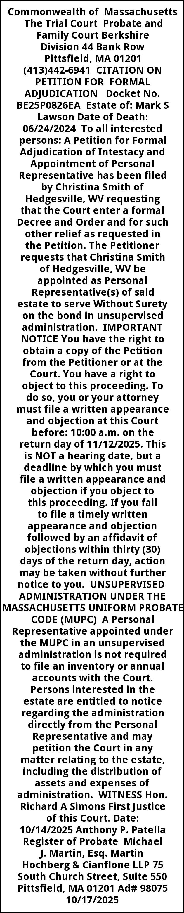 Commonwealth of Massachusetts The Trial Court Probate and Family Court Berkshire Division 44 Bank Row Pittsfield, MA 01201 (413)442-6941 CITATION ON PETITION FOR FORMAL ADJUDICATION Docket No. BE25P0826EA Estate of: Mark S Lawson Date of Death: 06/24/2024 To all interested persons: A Petition for Formal Adjudication of Intestacy and Appointment of Personal Representative has been filed by Christina Smith of Hedgesville, WV requesting that the Court enter a formal Decree and Order and for such other relief as requested in the Petition. The Petitioner requests that Christina Smith of Hedgesville, WV be appointed as Personal Representative(s) of said estate to serve Without Surety on the bond in unsupervised administration. IMPORTANT NOTICE You have the right to obtain a copy of the Petition from the Petitioner or at the Court. You have a right to object to this proceeding. To do so, you or your attorney must file a written appearance and objection at this Court before: 10:00 a.m. on the return day of 11/12/2025. This is NOT a hearing date, but a deadline by which you must file a written appearance and objection if you object to this proceeding. If you fail to file a timely written appearance and objection followed by an affidavit of objections within thirty (30) days of the return day, action may be taken without further notice to you. UNSUPERVISED ADMINISTRATION UNDER THE MASSACHUSETTS UNIFORM PROBATE CODE (MUPC) A Personal Representative appointed under the MUPC in an unsupervised administration is not required to file an inventory or annual accounts with the Court. Persons interested in the estate are entitled to notice regarding the administration directly from the Personal Representative and may petition the Court in any matter relating to the estate, including the distribution of assets and expenses of administration. WITNESS Hon. Richard A Simons First Justice of this Court. Date: 10/14/2025 Anthony P. Patella Register of Probate Michael J. Martin, Esq. Martin Hochberg & Cianflone LLP 75 South Church Street, Suite 550 Pittsfield, MA 01201 Ad# 98075 10/17/2025
