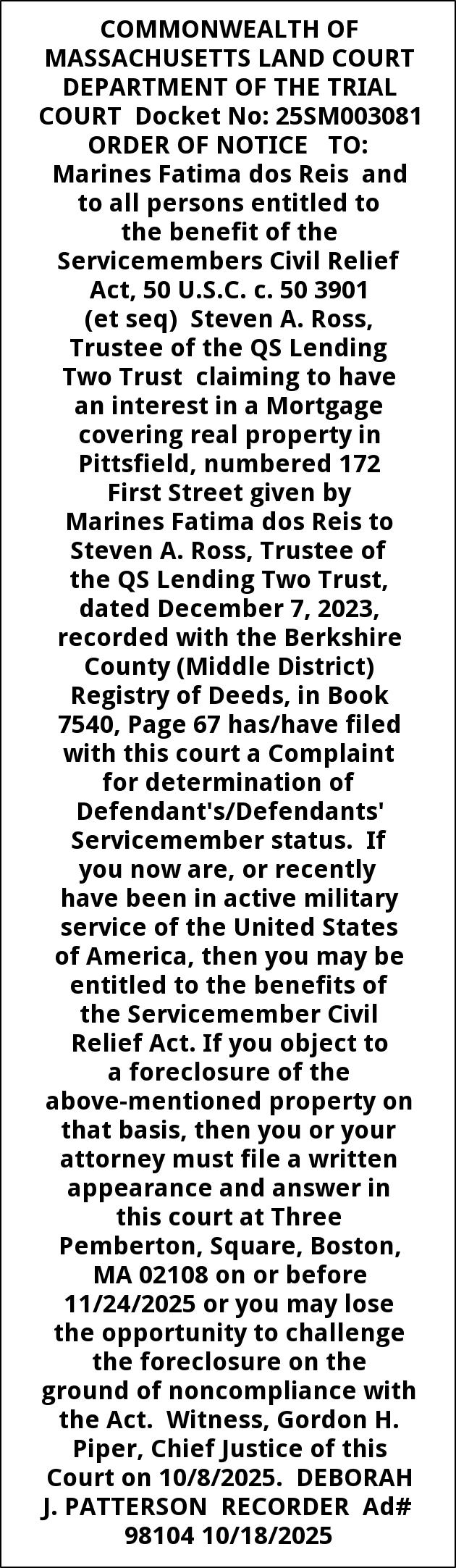 COMMONWEALTH OF MASSACHUSETTS LAND COURT DEPARTMENT OF THE TRIAL COURT Docket No: 25SM003081 ORDER OF NOTICE TO: Marines Fatima dos Reis and to all persons entitled to the benefit of the Servicemembers Civil Relief Act, 50 U.S.C. c. 50 3901 (et seq) Steven A. Ross, Trustee of the QS Lending Two Trust claiming to have an interest in a Mortgage covering real property in Pittsfield, numbered 172 First Street given by Marines Fatima dos Reis to Steven A. Ross, Trustee of the QS Lending Two Trust, dated December 7, 2023, recorded with the Berkshire County (Middle District) Registry of Deeds, in Book 7540, Page 67 has/have filed with this court a Complaint for determination of Defendant's/Defendants' Servicemember status. If you now are, or recently have been in active military service of the United States of America, then you may be entitled to the benefits of the Servicemember Civil Relief Act. If you object to a foreclosure of the above-mentioned property on that basis, then you or your attorney must file a written appearance and answer in this court at Three Pemberton, Square, Boston, MA 02108 on or before 11/24/2025 or you may lose the opportunity to challenge the foreclosure on the ground of noncompliance with the Act. Witness, Gordon H. Piper, Chief Justice of this Court on 10/8/2025. DEBORAH J. PATTERSON RECORDER Ad# 98104 10/18/2025
