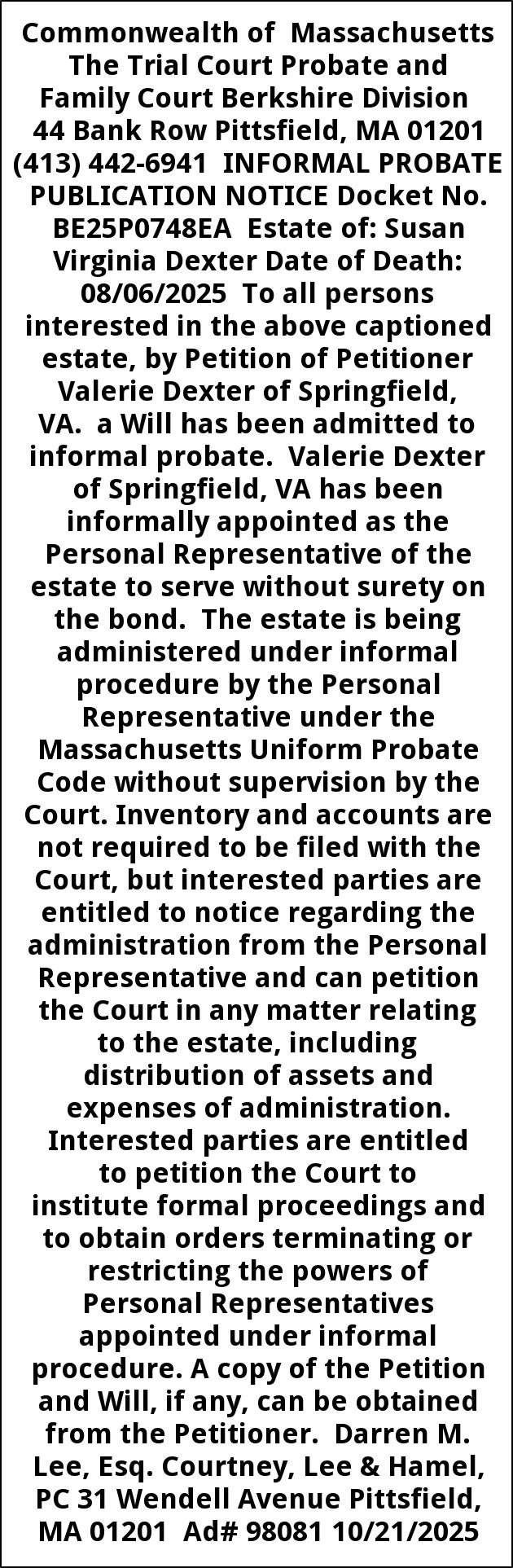 Commonwealth of Massachusetts The Trial Court Probate and Family Court Berkshire Division 44 Bank Row Pittsfield, MA 01201 (413) 442-6941 INFORMAL PROBATE PUBLICATION NOTICE Docket No. BE25P0748EA Estate of: Susan Virginia Dexter Date of Death: 08/06/2025 To all persons interested in the above captioned estate, by Petition of Petitioner Valerie Dexter of Springfield, VA. a Will has been admitted to informal probate. Valerie Dexter of Springfield, VA has been informally appointed as the Personal Representative of the estate to serve without surety on the bond. The estate is being administered under informal procedure by the Personal Representative under the Massachusetts Uniform Probate Code without supervision by the Court. Inventory and accounts are not required to be filed with the Court, but interested parties are entitled to notice regarding the administration from the Personal Representative and can petition the Court in any matter relating to the estate, including distribution of assets and expenses of administration. Interested parties are entitled to petition the Court to institute formal proceedings and to obtain orders terminating or restricting the powers of Personal Representatives appointed under informal procedure. A copy of the Petition and Will, if any, can be obtained from the Petitioner. Darren M. Lee, Esq. Courtney, Lee & Hamel, PC 31 Wendell Avenue Pittsfield, MA 01201 Ad# 98081 10/21/2025