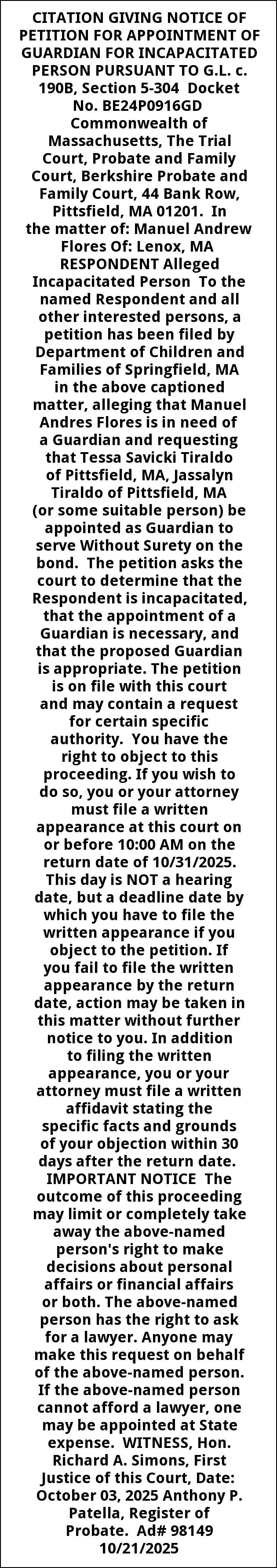 CITATION GIVING NOTICE OF PETITION FOR APPOINTMENT OF GUARDIAN FOR INCAPACITATED PERSON PURSUANT TO G.L. c. 190B, Section 5-304 Docket No. BE24P0916GD Commonwealth of Massachusetts, The Trial Court, Probate and Family Court, Berkshire Probate and Family Court, 44 Bank Row, Pittsfield, MA 01201. In the matter of: Manuel Andrew Flores Of: Lenox, MA RESPONDENT Alleged Incapacitated Person To the named Respondent and all other interested persons, a petition has been filed by Department of Children and Families of Springfield, MA in the above captioned matter, alleging that Manuel Andres Flores is in need of a Guardian and requesting that Tessa Savicki Tiraldo of Pittsfield, MA, Jassalyn Tiraldo of Pittsfield, MA (or some suitable person) be appointed as Guardian to serve Without Surety on the bond. The petition asks the court to determine that the Respondent is incapacitated, that the appointment of a Guardian is necessary, and that the proposed Guardian is appropriate. The petition is on file with this court and may contain a request for certain specific authority. You have the right to object to this proceeding. If you wish to do so, you or your attorney must file a written appearance at this court on or before 10:00 AM on the return date of 10/31/2025. This day is NOT a hearing date, but a deadline date by which you have to file the written appearance if you object to the petition. If you fail to file the written appearance by the return date, action may be taken in this matter without further notice to you. In addition to filing the written appearance, you or your attorney must file a written affidavit stating the specific facts and grounds of your objection within 30 days after the return date. IMPORTANT NOTICE The outcome of this proceeding may limit or completely take away the above-named person's right to make decisions about personal affairs or financial affairs or both. The above-named person has the right to ask for a lawyer. Anyone may make this request on behalf of the above-named person. If the above-named person cannot afford a lawyer, one may be appointed at State expense. WITNESS, Hon. Richard A. Simons, First Justice of this Court, Date: October 03, 2025 Anthony P. Patella, Register of Probate. Ad# 98149 10/21/2025