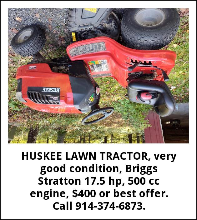 HUSKEE LAWN TRACTOR, very good condition, Briggs Stratton 17.5 hp, 500 cc engine, $400 or best offer. Call 914-374-6873.