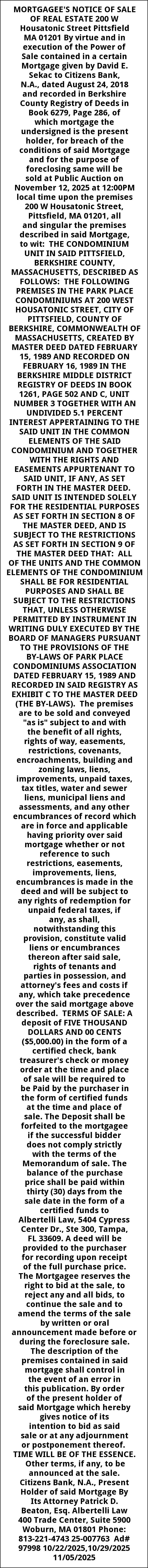 MORTGAGEE'S NOTICE OF SALE OF REAL ESTATE 200 W Housatonic Street Pittsfield MA 01201 By virtue and in execution of the Power of Sale contained in a certain Mortgage given by David E. Sekac to Citizens Bank, N.A., dated August 24, 2018 and recorded in Berkshire County Registry of Deeds in Book 6279, Page 286, of which mortgage the undersigned is the present holder, for breach of the conditions of said Mortgage and for the purpose of foreclosing same will be sold at Public Auction on November 12, 2025 at 12:00PM local time upon the premises 200 W Housatonic Street, Pittsfield, MA 01201, all and singular the premises described in said Mortgage, to wit: THE CONDOMINIUM UNIT IN SAID PITTSFIELD, BERKSHIRE COUNTY, MASSACHUSETTS, DESCRIBED AS FOLLOWS: THE FOLLOWING PREMISES IN THE PARK PLACE CONDOMINIUMS AT 200 WEST HOUSATONIC STREET, CITY OF PITTSFIELD, COUNTY OF BERKSHIRE, COMMONWEALTH OF MASSACHUSETTS, CREATED BY MASTER DEED DATED FEBRUARY 15, 1989 AND RECORDED ON FEBRUARY 16, 1989 IN THE BERKSHIRE MIDDLE DISTRICT REGISTRY OF DEEDS IN BOOK 1261, PAGE 502 AND C, UNIT NUMBER 3 TOGETHER WITH AN UNDIVIDED 5.1 PERCENT INTEREST APPERTAINING TO THE SAID UNIT IN THE COMMON ELEMENTS OF THE SAID CONDOMINIUM AND TOGETHER WITH THE RIGHTS AND EASEMENTS APPURTENANT TO SAID UNIT, IF ANY, AS SET FORTH IN THE MASTER DEED. SAID UNIT IS INTENDED SOLELY FOR THE RESIDENTIAL PURPOSES AS SET FORTH IN SECTION 8 OF THE MASTER DEED, AND IS SUBJECT TO THE RESTRICTIONS AS SET FORTH IN SECTION 9 OF THE MASTER DEED THAT: ALL OF THE UNITS AND THE COMMON ELEMENTS OF THE CONDOMINIUM SHALL BE FOR RESIDENTIAL PURPOSES AND SHALL BE SUBJECT TO THE RESTRICTIONS THAT, UNLESS OTHERWISE PERMITTED BY INSTRUMENT IN WRITING DULY EXECUTED BY THE BOARD OF MANAGERS PURSUANT TO THE PROVISIONS OF THE BY-LAWS OF PARK PLACE CONDOMINIUMS ASSOCIATION DATED FEBRUARY 15, 1989 AND RECORDED IN SAID REGISTRY AS EXHIBIT C TO THE MASTER DEED (THE BY-LAWS). The premises are to be sold and conveyed "as is" subject to and with the benefit of all rights, rights of way, easements, restrictions, covenants, encroachments, building and zoning laws, liens, improvements, unpaid taxes, tax titles, water and sewer liens, municipal liens and assessments, and any other encumbrances of record which are in force and applicable having priority over said mortgage whether or not reference to such restrictions, easements, improvements, liens, encumbrances is made in the deed and will be subject to any rights of redemption for unpaid federal taxes, if any, as shall, notwithstanding this provision, constitute valid liens or encumbrances thereon after said sale, rights of tenants and parties in possession, and attorney's fees and costs if any, which take precedence over the said mortgage above described. TERMS OF SALE: A deposit of FIVE THOUSAND DOLLARS AND 00 CENTS ($5,000.00) in the form of a certified check, bank treasurer's check or money order at the time and place of sale will be required to be Paid by the purchaser in the form of certified funds at the time and place of sale. The Deposit shall be forfeited to the mortgagee if the successful bidder does not comply strictly with the terms of the Memorandum of sale. The balance of the purchase price shall be paid within thirty (30) days from the sale date in the form of a certified funds to Albertelli Law, 5404 Cypress Center Dr., Ste 300, Tampa, FL 33609. A deed will be provided to the purchaser for recording upon receipt of the full purchase price. The Mortgagee reserves the right to bid at the sale, to reject any and all bids, to continue the sale and to amend the terms of the sale by written or oral announcement made before or during the foreclosure sale. The description of the premises contained in said mortgage shall control in the event of an error in this publication. By order of the present holder of said Mortgage which hereby gives notice of its intention to bid as said sale or at any adjournment or postponement thereof. TIME WILL BE OF THE ESSENCE. Other terms, if any, to be announced at the sale. Citizens Bank, N.A., Present Holder of said Mortgage By Its Attorney Patrick D. Beaton, Esq. Albertelli Law 400 Trade Center, Suite 5900 Woburn, MA 01801 Phone: 813-221-4743 25-007763 Ad# 97998 10/22/2025,10/29/2025 11/05/2025