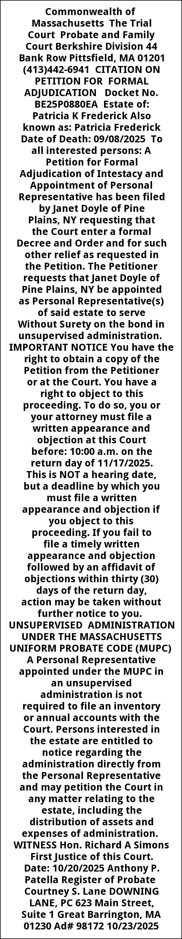 Commonwealth of Massachusetts The Trial Court Probate and Family Court Berkshire Division 44 Bank Row Pittsfield, MA 01201 (413)442-6941 CITATION ON PETITION FOR FORMAL ADJUDICATION Docket No. BE25P0880EA Estate of: Patricia K Frederick Also known as: Patricia Frederick Date of Death: 09/08/2025 To all interested persons: A Petition for Formal Adjudication of Intestacy and Appointment of Personal Representative has been filed by Janet Doyle of Pine Plains, NY requesting that the Court enter a formal Decree and Order and for such other relief as requested in the Petition. The Petitioner requests that Janet Doyle of Pine Plains, NY be appointed as Personal Representative(s) of said estate to serve Without Surety on the bond in unsupervised administration. IMPORTANT NOTICE You have the right to obtain a copy of the Petition from the Petitioner or at the Court. You have a right to object to this proceeding. To do so, you or your attorney must file a written appearance and objection at this Court before: 10:00 a.m. on the return day of 11/17/2025. This is NOT a hearing date, but a deadline by which you must file a written appearance and objection if you object to this proceeding. If you fail to file a timely written appearance and objection followed by an affidavit of objections within thirty (30) days of the return day, action may be taken without further notice to you. UNSUPERVISED ADMINISTRATION UNDER THE MASSACHUSETTS UNIFORM PROBATE CODE (MUPC) A Personal Representative appointed under the MUPC in an unsupervised administration is not required to file an inventory or annual accounts with the Court. Persons interested in the estate are entitled to notice regarding the administration directly from the Personal Representative and may petition the Court in any matter relating to the estate, including the distribution of assets and expenses of administration. WITNESS Hon. Richard A Simons First Justice of this Court. Date: 10/20/2025 Anthony P. Patella Register of Probate Courtney S. Lane DOWNING LANE, PC 623 Main Street, Suite 1 Great Barrington, MA 01230 Ad# 98172 10/23/2025