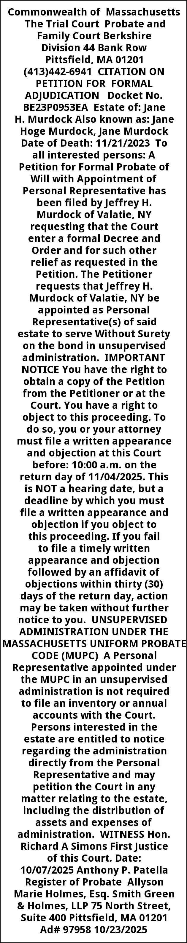 Commonwealth of Massachusetts The Trial Court Probate and Family Court Berkshire Division 44 Bank Row Pittsfield, MA 01201 (413)442-6941 CITATION ON PETITION FOR FORMAL ADJUDICATION Docket No. BE23P0953EA Estate of: Jane H. Murdock Also known as: Jane Hoge Murdock, Jane Murdock Date of Death: 11/21/2023 To all interested persons: A Petition for Formal Probate of Will with Appointment of Personal Representative has been filed by Jeffrey H. Murdock of Valatie, NY requesting that the Court enter a formal Decree and Order and for such other relief as requested in the Petition. The Petitioner requests that Jeffrey H. Murdock of Valatie, NY be appointed as Personal Representative(s) of said estate to serve Without Surety on the bond in unsupervised administration. IMPORTANT NOTICE You have the right to obtain a copy of the Petition from the Petitioner or at the Court. You have a right to object to this proceeding. To do so, you or your attorney must file a written appearance and objection at this Court before: 10:00 a.m. on the return day of 11/04/2025. This is NOT a hearing date, but a deadline by which you must file a written appearance and objection if you object to this proceeding. If you fail to file a timely written appearance and objection followed by an affidavit of objections within thirty (30) days of the return day, action may be taken without further notice to you. UNSUPERVISED ADMINISTRATION UNDER THE MASSACHUSETTS UNIFORM PROBATE CODE (MUPC) A Personal Representative appointed under the MUPC in an unsupervised administration is not required to file an inventory or annual accounts with the Court. Persons interested in the estate are entitled to notice regarding the administration directly from the Personal Representative and may petition the Court in any matter relating to the estate, including the distribution of assets and expenses of administration. WITNESS Hon. Richard A Simons First Justice of this Court. Date: 10/07/2025 Anthony P. Patella Register of Probate Allyson Marie Holmes, Esq. Smith Green & Holmes, LLP 75 North Street, Suite 400 Pittsfield, MA 01201 Ad# 97958 10/23/2025