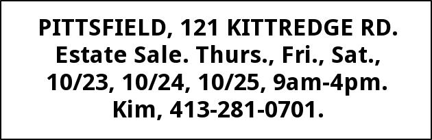PITTSFIELD, 121 KITTREDGE RD. Estate Sale. Thurs., Fri., Sat., 10/23, 10/24, 10/25, 9am-4pm. Kim, 413-281-0701.