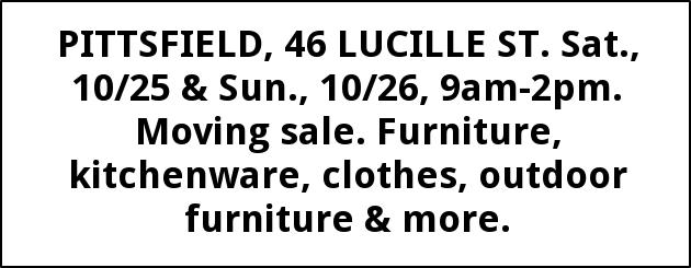 PITTSFIELD, 46 LUCILLE ST. Sat., 10/25 & Sun., 10/26, 9am-2pm. Moving sale. Furniture, kitchenware, clothes, outdoor furniture & more.