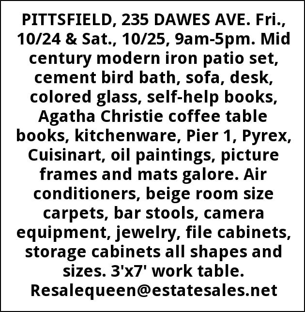 PITTSFIELD, 235 DAWES AVE. Fri., 10/24 & Sat., 10/25, 9am-5pm. Mid century modern iron patio set, cement bird bath, sofa, desk, colored glass, self-help books, Agatha Christie coffee table books, kitchenware, Pier 1, Pyrex, Cuisinart, oil paintings, picture frames and mats galore. Air conditioners, beige room size carpets, bar stools, camera equipment, jewelry, file cabinets, storage cabinets all shapes and sizes. 3'x7' work table. Resalequeen@estatesales.net