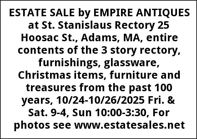 ESTATE SALE by EMPIRE ANTIQUES at St. Stanislaus Rectory 25 Hoosac St., Adams, MA, entire contents of the 3 story rectory, furnishings, glassware, Christmas items, furniture and treasures from the past 100 years, 10/24-10/26/2025 Fri. & Sat. 9-4, Sun 10:00-3:30, For photos see www.estatesales.net