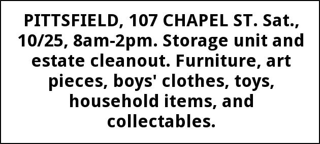 PITTSFIELD, 107 CHAPEL ST. Sat., 10/25, 8am-2pm. Storage unit and estate cleanout. Furniture, art pieces, boys' clothes, toys, household items, and collectables.