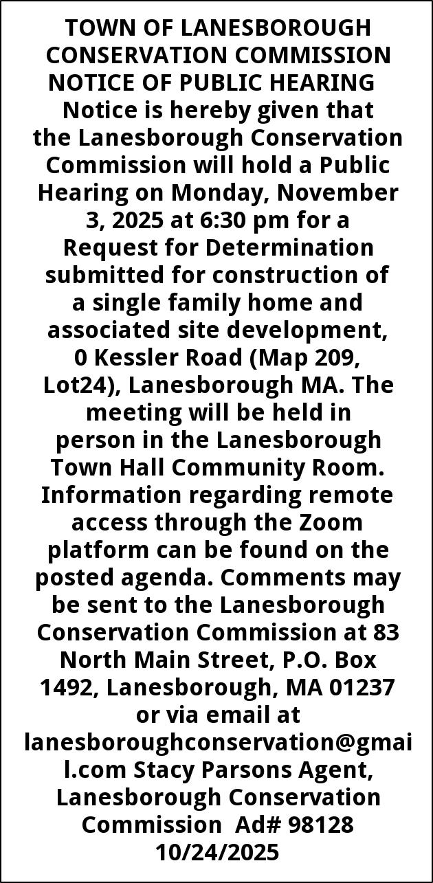 TOWN OF LANESBOROUGH CONSERVATION COMMISSION NOTICE OF PUBLIC HEARING Notice is hereby given that the Lanesborough Conservation Commission will hold a Public Hearing on Monday, November 3, 2025 at 6:30 pm for a Request for Determination submitted for construction of a single family home and associated site development, 0 Kessler Road (Map 209, Lot24), Lanesborough MA. The meeting will be held in person in the Lanesborough Town Hall Community Room. Information regarding remote access through the Zoom platform can be found on the posted agenda. Comments may be sent to the Lanesborough Conservation Commission at 83 North Main Street, P.O. Box 1492, Lanesborough, MA 01237 or via email at lanesboroughconservation@gmail.com Stacy Parsons Agent, Lanesborough Conservation Commission Ad# 98128 10/24/2025