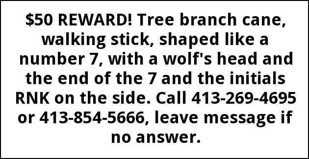 $50 REWARD! Tree branch cane, walking stick, shaped like a number 7, with a wolf's head and the end of the 7 and the initials RNK on the side. Call 413-269-4695 or 413-854-5666, leave message if no answer.