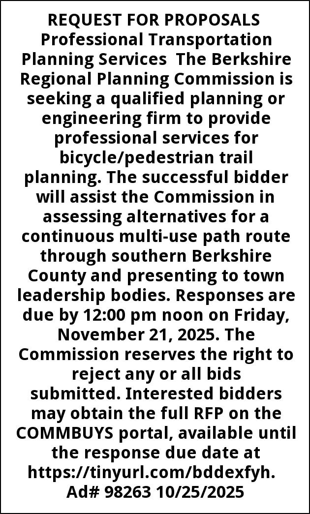 REQUEST FOR PROPOSALS Professional Transportation Planning Services The Berkshire Regional Planning Commission is seeking a qualified planning or engineering firm to provide professional services for bicycle/pedestrian trail planning. The successful bidder will assist the Commission in assessing alternatives for a continuous multi-use path route through southern Berkshire County and presenting to town leadership bodies. Responses are due by 12:00 pm noon on Friday, November 21, 2025. The Commission reserves the right to reject any or all bids submitted. Interested bidders may obtain the full RFP on the COMMBUYS portal, available until the response due date at https://tinyurl.com/bddexfyh. Ad# 98263 10/25/2025