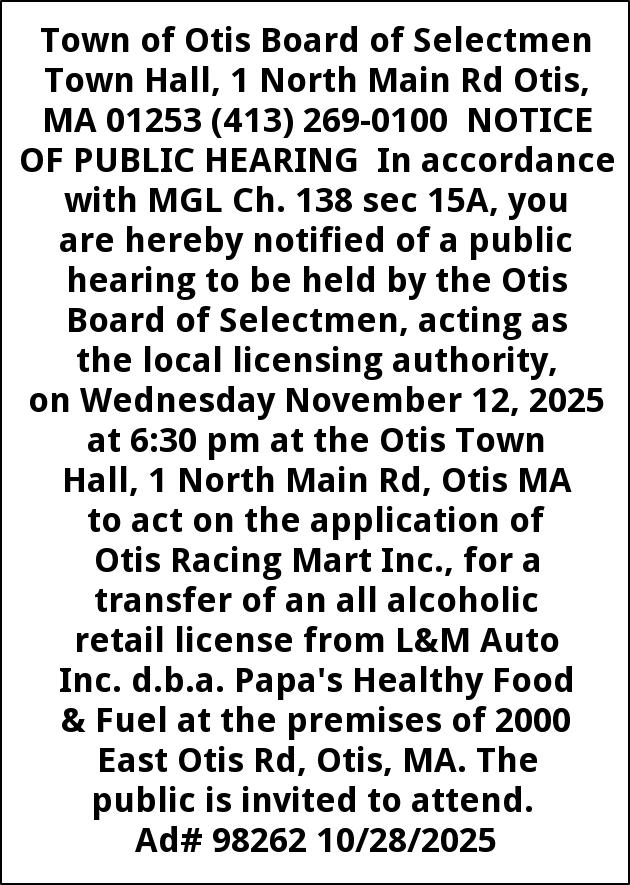 Town of Otis Board of Selectmen Town Hall, 1 North Main Rd Otis, MA 01253 (413) 269-0100 NOTICE OF PUBLIC HEARING In accordance with MGL Ch. 138 sec 15A, you are hereby notified of a public hearing to be held by the Otis Board of Selectmen, acting as the local licensing authority, on Wednesday November 12, 2025 at 6:30 pm at the Otis Town Hall, 1 North Main Rd, Otis MA to act on the application of Otis Racing Mart Inc., for a transfer of an all alcoholic retail license from L&M Auto Inc. d.b.a. Papa's Healthy Food & Fuel at the premises of 2000 East Otis Rd, Otis, MA. The public is invited to attend. Ad# 98262 10/28/2025