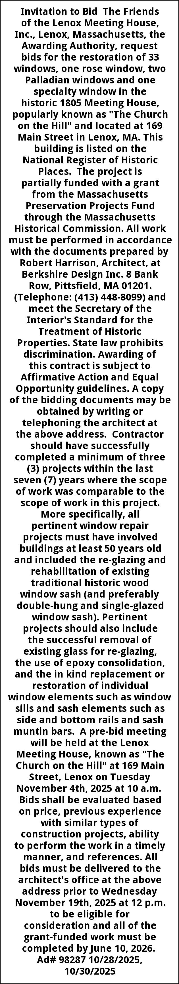 Invitation to Bid The Friends of the Lenox Meeting House, Inc., Lenox, Massachusetts, the Awarding Authority, request bids for the restoration of 33 windows, one rose window, two Palladian windows and one specialty window in the historic 1805 Meeting House, popularly known as "The Church on the Hill" and located at 169 Main Street in Lenox, MA. This building is listed on the National Register of Historic Places. The project is partially funded with a grant from the Massachusetts Preservation Projects Fund through the Massachusetts Historical Commission. All work must be performed in accordance with the documents prepared by Robert Harrison, Architect, at Berkshire Design Inc. 8 Bank Row, Pittsfield, MA 01201. (Telephone: (413) 448-8099) and meet the Secretary of the Interior's Standard for the Treatment of Historic Properties. State law prohibits discrimination. Awarding of this contract is subject to Affirmative Action and Equal Opportunity guidelines. A copy of the bidding documents may be obtained by writing or telephoning the architect at the above address. Contractor should have successfully completed a minimum of three (3) projects within the last seven (7) years where the scope of work was comparable to the scope of work in this project. More specifically, all pertinent window repair projects must have involved buildings at least 50 years old and included the re-glazing and rehabilitation of existing traditional historic wood window sash (and preferably double-hung and single-glazed window sash). Pertinent projects should also include the successful removal of existing glass for re-glazing, the use of epoxy consolidation, and the in kind replacement or restoration of individual window elements such as window sills and sash elements such as side and bottom rails and sash muntin bars. A pre-bid meeting will be held at the Lenox Meeting House, known as "The Church on the Hill" at 169 Main Street, Lenox on Tuesday November 4th, 2025 at 10 a.m. Bids shall be evaluated based on price, previous experience with similar types of construction projects, ability to perform the work in a timely manner, and references. All bids must be delivered to the architect's office at the above address prior to Wednesday November 19th, 2025 at 12 p.m. to be eligible for consideration and all of the grant-funded work must be completed by June 10, 2026. Ad# 98287 10/28/2025, 10/30/2025