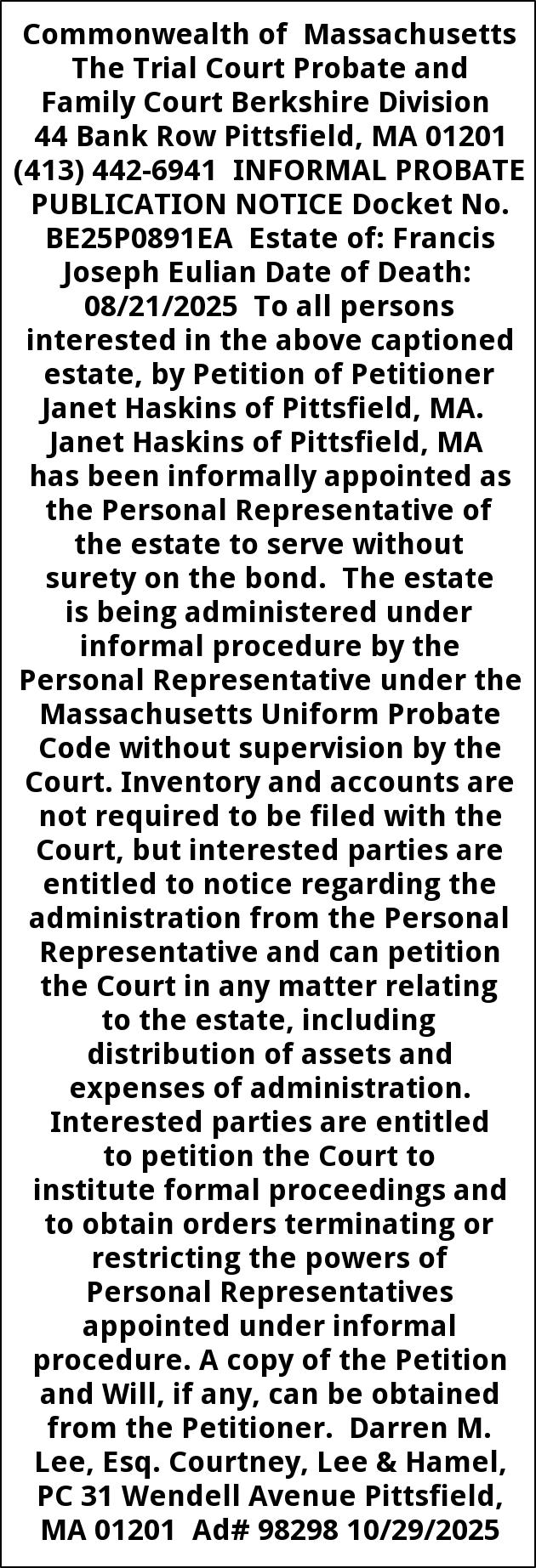 Commonwealth of Massachusetts The Trial Court Probate and Family Court Berkshire Division 44 Bank Row Pittsfield, MA 01201 (413) 442-6941 INFORMAL PROBATE PUBLICATION NOTICE Docket No. BE25P0891EA Estate of: Francis Joseph Eulian Date of Death: 08/21/2025 To all persons interested in the above captioned estate, by Petition of Petitioner Janet Haskins of Pittsfield, MA. Janet Haskins of Pittsfield, MA has been informally appointed as the Personal Representative of the estate to serve without surety on the bond. The estate is being administered under informal procedure by the Personal Representative under the Massachusetts Uniform Probate Code without supervision by the Court. Inventory and accounts are not required to be filed with the Court, but interested parties are entitled to notice regarding the administration from the Personal Representative and can petition the Court in any matter relating to the estate, including distribution of assets and expenses of administration. Interested parties are entitled to petition the Court to institute formal proceedings and to obtain orders terminating or restricting the powers of Personal Representatives appointed under informal procedure. A copy of the Petition and Will, if any, can be obtained from the Petitioner. Darren M. Lee, Esq. Courtney, Lee & Hamel, PC 31 Wendell Avenue Pittsfield, MA 01201 Ad# 98298 10/29/2025