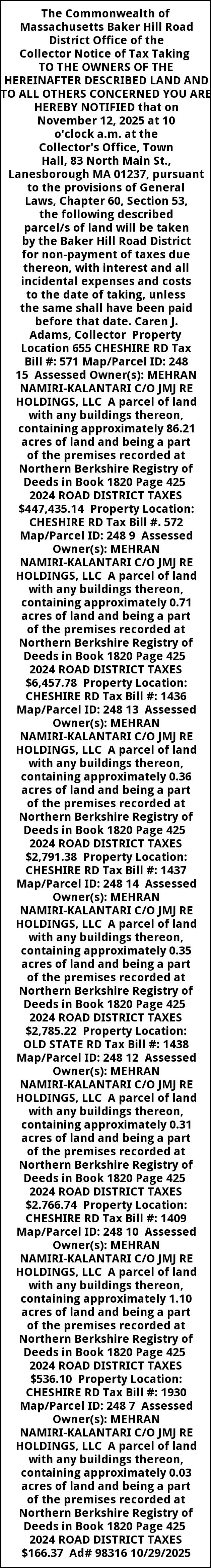 The Commonwealth of Massachusetts Baker Hill Road District Office of the Collector Notice of Tax Taking TO THE OWNERS OF THE HEREINAFTER DESCRIBED LAND AND TO ALL OTHERS CONCERNED YOU ARE HEREBY NOTIFIED that on November 12, 2025 at 10 o'clock a.m. at the Collector's Office, Town Hall, 83 North Main St., Lanesborough MA 01237, pursuant to the provisions of General Laws, Chapter 60, Section 53, the following described parcel/s of land will be taken by the Baker Hill Road District for non-payment of taxes due thereon, with interest and all incidental expenses and costs to the date of taking, unless the same shall have been paid before that date. Caren J. Adams, Collector Property Location 655 CHESHIRE RD Tax Bill #: 571 Map/Parcel ID: 248 15 Assessed Owner(s): MEHRAN NAMIRI-KALANTARI C/O JMJ RE HOLDINGS, LLC A parcel of land with any buildings thereon, containing approximately 86.21 acres of land and being a part of the premises recorded at Northern Berkshire Registry of Deeds in Book 1820 Page 425 2024 ROAD DISTRICT TAXES $447,435.14 Property Location: CHESHIRE RD Tax Bill #. 572 Map/Parcel ID: 248 9 Assessed Owner(s): MEHRAN NAMIRI-KALANTARI C/O JMJ RE HOLDINGS, LLC A parcel of land with any buildings thereon, containing approximately 0.71 acres of land and being a part of the premises recorded at Northern Berkshire Registry of Deeds in Book 1820 Page 425 2024 ROAD DISTRICT TAXES $6,457.78 Property Location: CHESHIRE RD Tax Bill #: 1436 Map/Parcel ID: 248 13 Assessed Owner(s): MEHRAN NAMIRI-KALANTARI C/O JMJ RE HOLDINGS, LLC A parcel of land with any buildings thereon, containing approximately 0.36 acres of land and being a part of the premises recorded at Northern Berkshire Registry of Deeds in Book 1820 Page 425 2024 ROAD DISTRICT TAXES $2,791.38 Property Location: CHESHIRE RD Tax Bill #: 1437 Map/Parcel ID: 248 14 Assessed Owner(s): MEHRAN NAMIRI-KALANTARI C/O JMJ RE HOLDINGS, LLC A parcel of land with any buildings thereon, containing approximately 0.35 acres of land and being a part of the premises recorded at Northern Berkshire Registry of Deeds in Book 1820 Page 425 2024 ROAD DISTRICT TAXES $2,785.22 Property Location: OLD STATE RD Tax Bill #: 1438 Map/Parcel ID: 248 12 Assessed Owner(s): MEHRAN NAMIRI-KALANTARI C/O JMJ RE HOLDINGS, LLC A parcel of land with any buildings thereon, containing approximately 0.31 acres of land and being a part of the premises recorded at Northern Berkshire Registry of Deeds in Book 1820 Page 425 2024 ROAD DISTRICT TAXES $2.766.74 Property Location: CHESHIRE RD Tax Bill #: 1409 Map/Parcel ID: 248 10 Assessed Owner(s): MEHRAN NAMIRI-KALANTARI C/O JMJ RE HOLDINGS, LLC A parcel of land with any buildings thereon, containing approximately 1.10 acres of land and being a part of the premises recorded at Northern Berkshire Registry of Deeds in Book 1820 Page 425 2024 ROAD DISTRICT TAXES $536.10 Property Location: CHESHIRE RD Tax Bill #: 1930 Map/Parcel ID: 248 7 Assessed Owner(s): MEHRAN NAMIRI-KALANTARI C/O JMJ RE HOLDINGS, LLC A parcel of land with any buildings thereon, containing approximately 0.03 acres of land and being a part of the premises recorded at Northern Berkshire Registry of Deeds in Book 1820 Page 425 2024 ROAD DISTRICT TAXES $166.37 Ad# 98316 10/29/2025