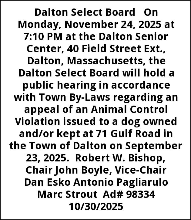 Dalton Select Board On Monday, November 24, 2025 at 7:10 PM at the Dalton Senior Center, 40 Field Street Ext., Dalton, Massachusetts, the Dalton Select Board will hold a public hearing in accordance with Town By-Laws regarding an appeal of an Animal Control Violation issued to a dog owned and/or kept at 71 Gulf Road in the Town of Dalton on September 23, 2025. Robert W. Bishop, Chair John Boyle, Vice-Chair Dan Esko Antonio Pagliarulo Marc Strout Ad# 98334 10/30/2025