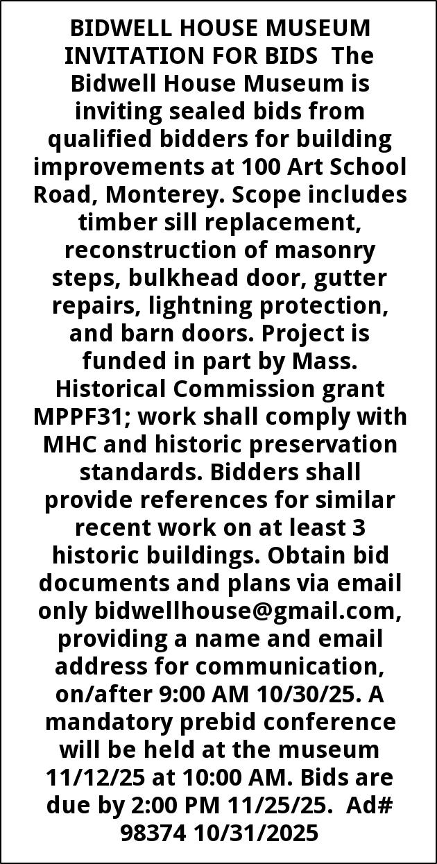 BIDWELL HOUSE MUSEUM INVITATION FOR BIDS The Bidwell House Museum is inviting sealed bids from qualified bidders for building improvements at 100 Art School Road, Monterey. Scope includes timber sill replacement, reconstruction of masonry steps, bulkhead door, gutter repairs, lightning protection, and barn doors. Project is funded in part by Mass. Historical Commission grant MPPF31; work shall comply with MHC and historic preservation standards. Bidders shall provide references for similar recent work on at least 3 historic buildings. Obtain bid documents and plans via email only bidwellhouse@gmail.com, providing a name and email address for communication, on/after 9:00 AM 10/30/25. A mandatory prebid conference will be held at the museum 11/12/25 at 10:00 AM. Bids are due by 2:00 PM 11/25/25. Ad# 98374 10/31/2025