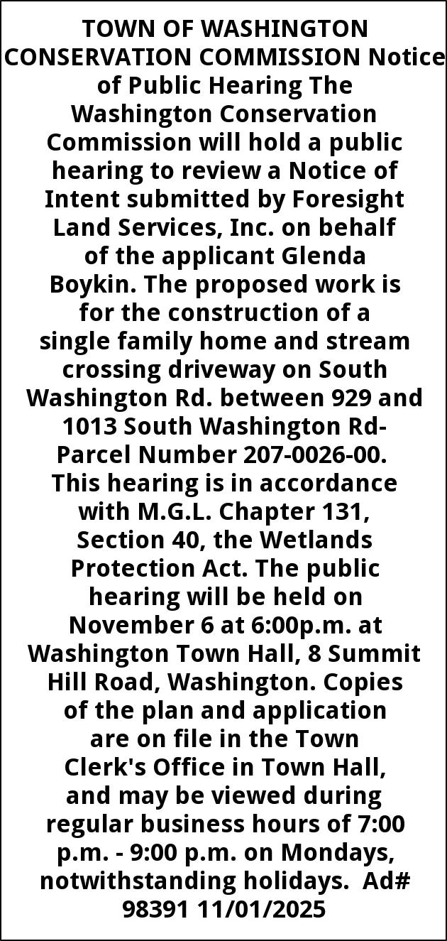 TOWN OF WASHINGTON CONSERVATION COMMISSION Notice of Public Hearing The Washington Conservation Commission will hold a public hearing to review a Notice of Intent submitted by Foresight Land Services, Inc. on behalf of the applicant Glenda Boykin. The proposed work is for the construction of a single family home and stream crossing driveway on South Washington Rd. between 929 and 1013 South Washington Rd- Parcel Number 207-0026-00. This hearing is in accordance with M.G.L. Chapter 131, Section 40, the Wetlands Protection Act. The public hearing will be held on November 6 at 6:00p.m. at Washington Town Hall, 8 Summit Hill Road, Washington. Copies of the plan and application are on file in the Town Clerk's Office in Town Hall, and may be viewed during regular business hours of 7:00 p.m. - 9:00 p.m. on Mondays, notwithstanding holidays. Ad# 98391 11/01/2025