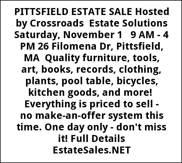PITTSFIELD ESTATE SALE Hosted by Crossroads Estate Solutions Saturday, November 1 9 AM - 4 PM 26 Filomena Dr, Pittsfield, MA Quality furniture, tools, art, books, records, clothing, plants, pool table, bicycles, kitchen goods, and more! Everything is priced to sell - no make-an-offer system this time. One day only - don't miss it! Full Details EstateSales.NET