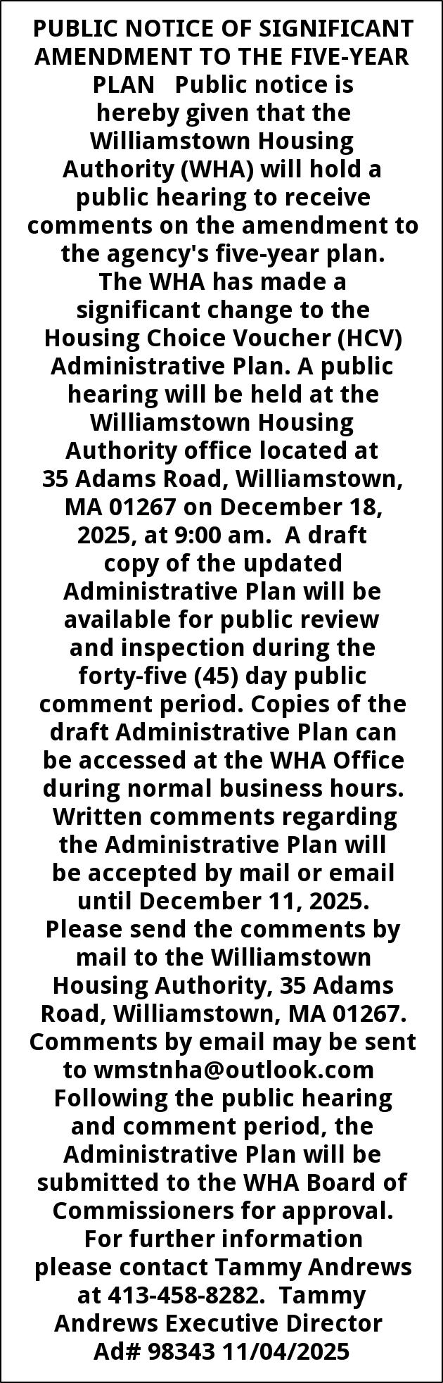 PUBLIC NOTICE OF SIGNIFICANT AMENDMENT TO THE FIVE-YEAR PLAN Public notice is hereby given that the Williamstown Housing Authority (WHA) will hold a public hearing to receive comments on the amendment to the agency's five-year plan. The WHA has made a significant change to the Housing Choice Voucher (HCV) Administrative Plan. A public hearing will be held at the Williamstown Housing Authority office located at 35 Adams Road, Williamstown, MA 01267 on December 18, 2025, at 9:00 am. A draft copy of the updated Administrative Plan will be available for public review and inspection during the forty-five (45) day public comment period. Copies of the draft Administrative Plan can be accessed at the WHA Office during normal business hours. Written comments regarding the Administrative Plan will be accepted by mail or email until December 11, 2025. Please send the comments by mail to the Williamstown Housing Authority, 35 Adams Road, Williamstown, MA 01267. Comments by email may be sent to wmstnha@outlook.com Following the public hearing and comment period, the Administrative Plan will be submitted to the WHA Board of Commissioners for approval. For further information please contact Tammy Andrews at 413-458-8282. Tammy Andrews Executive Director Ad# 98343 11/04/2025
