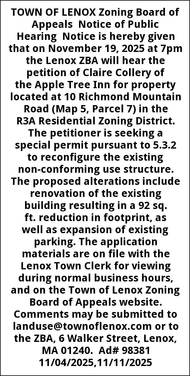 TOWN OF LENOX Zoning Board of Appeals Notice of Public Hearing Notice is hereby given that on November 19, 2025 at 7pm the Lenox ZBA will hear the petition of Claire Collery of the Apple Tree Inn for property located at 10 Richmond Mountain Road (Map 5, Parcel 7) in the R3A Residential Zoning District. The petitioner is seeking a special permit pursuant to 5.3.2 to reconfigure the existing non-conforming use structure. The proposed alterations include renovation of the existing building resulting in a 92 sq. ft. reduction in footprint, as well as expansion of existing parking. The application materials are on file with the Lenox Town Clerk for viewing during normal business hours, and on the Town of Lenox Zoning Board of Appeals website. Comments may be submitted to landuse@townoflenox.com or to the ZBA, 6 Walker Street, Lenox, MA 01240. Ad# 98381 11/04/2025,11/11/2025