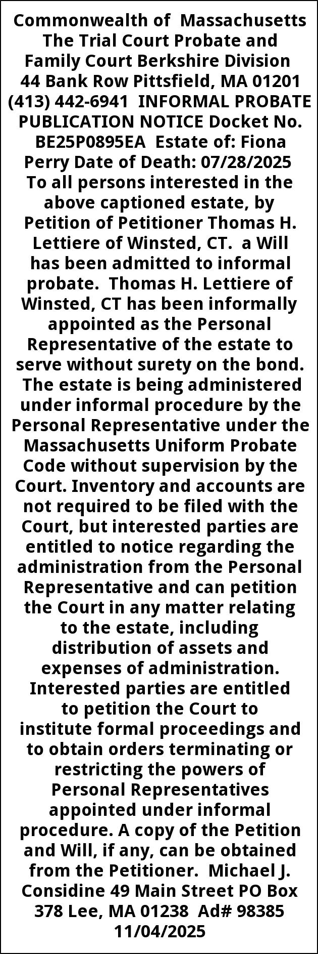 Commonwealth of Massachusetts The Trial Court Probate and Family Court Berkshire Division 44 Bank Row Pittsfield, MA 01201 (413) 442-6941 INFORMAL PROBATE PUBLICATION NOTICE Docket No. BE25P0895EA Estate of: Fiona Perry Date of Death: 07/28/2025 To all persons interested in the above captioned estate, by Petition of Petitioner Thomas H. Lettiere of Winsted, CT. a Will has been admitted to informal probate. Thomas H. Lettiere of Winsted, CT has been informally appointed as the Personal Representative of the estate to serve without surety on the bond. The estate is being administered under informal procedure by the Personal Representative under the Massachusetts Uniform Probate Code without supervision by the Court. Inventory and accounts are not required to be filed with the Court, but interested parties are entitled to notice regarding the administration from the Personal Representative and can petition the Court in any matter relating to the estate, including distribution of assets and expenses of administration. Interested parties are entitled to petition the Court to institute formal proceedings and to obtain orders terminating or restricting the powers of Personal Representatives appointed under informal procedure. A copy of the Petition and Will, if any, can be obtained from the Petitioner. Michael J. Considine 49 Main Street PO Box 378 Lee, MA 01238 Ad# 98385 11/04/2025