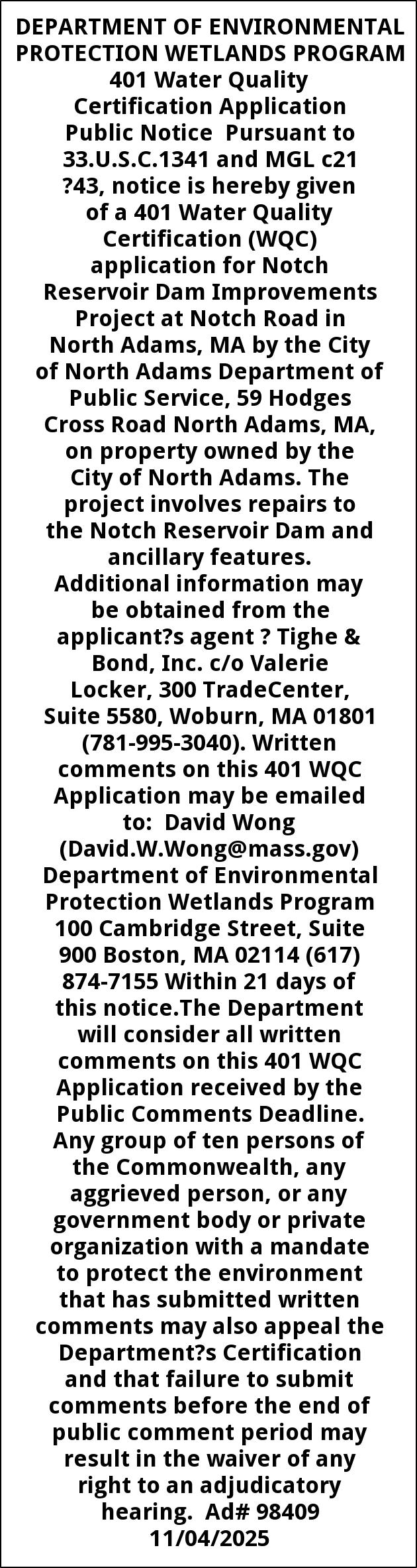 DEPARTMENT OF ENVIRONMENTAL PROTECTION WETLANDS PROGRAM 401 Water Quality Certification Application Public Notice Pursuant to 33.U.S.C.1341 and MGL c21 ?43, notice is hereby given of a 401 Water Quality Certification (WQC) application for Notch Reservoir Dam Improvements Project at Notch Road in North Adams, MA by the City of North Adams Department of Public Service, 59 Hodges Cross Road North Adams, MA, on property owned by the City of North Adams. The project involves repairs to the Notch Reservoir Dam and ancillary features. Additional information may be obtained from the applicant?s agent ? Tighe & Bond, Inc. c/o Valerie Locker, 300 TradeCenter, Suite 5580, Woburn, MA 01801 (781-995-3040). Written comments on this 401 WQC Application may be emailed to: David Wong (David.W.Wong@mass.gov) Department of Environmental Protection Wetlands Program 100 Cambridge Street, Suite 900 Boston, MA 02114 (617) 874-7155 Within 21 days of this notice.The Department will consider all written comments on this 401 WQC Application received by the Public Comments Deadline. Any group of ten persons of the Commonwealth, any aggrieved person, or any government body or private organization with a mandate to protect the environment that has submitted written comments may also appeal the Department?s Certification and that failure to submit comments before the end of public comment period may result in the waiver of any right to an adjudicatory hearing. Ad# 98409 11/04/2025