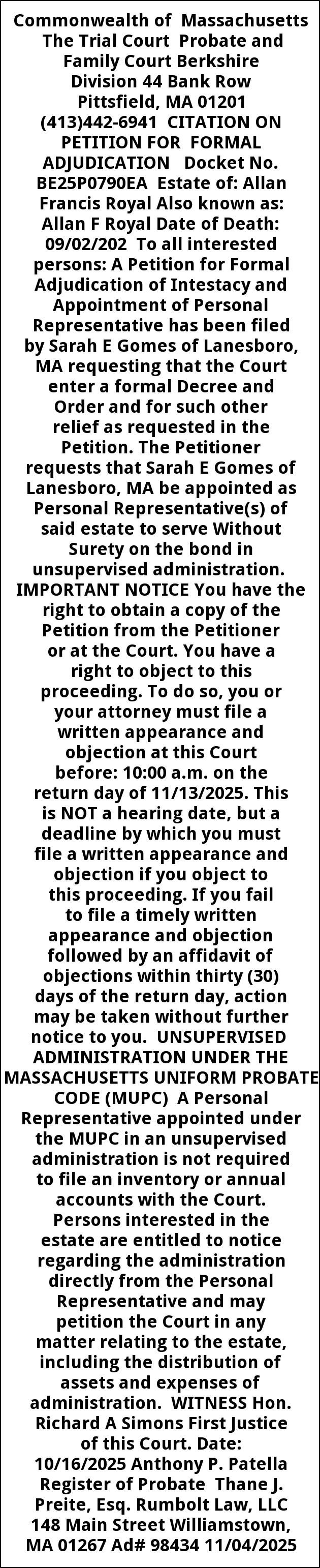 Commonwealth of Massachusetts The Trial Court Probate and Family Court Berkshire Division 44 Bank Row Pittsfield, MA 01201 (413)442-6941 CITATION ON PETITION FOR FORMAL ADJUDICATION Docket No. BE25P0790EA Estate of: Allan Francis Royal Also known as: Allan F Royal Date of Death: 09/02/202 To all interested persons: A Petition for Formal Adjudication of Intestacy and Appointment of Personal Representative has been filed by Sarah E Gomes of Lanesboro, MA requesting that the Court enter a formal Decree and Order and for such other relief as requested in the Petition. The Petitioner requests that Sarah E Gomes of Lanesboro, MA be appointed as Personal Representative(s) of said estate to serve Without Surety on the bond in unsupervised administration. IMPORTANT NOTICE You have the right to obtain a copy of the Petition from the Petitioner or at the Court. You have a right to object to this proceeding. To do so, you or your attorney must file a written appearance and objection at this Court before: 10:00 a.m. on the return day of 11/13/2025. This is NOT a hearing date, but a deadline by which you must file a written appearance and objection if you object to this proceeding. If you fail to file a timely written appearance and objection followed by an affidavit of objections within thirty (30) days of the return day, action may be taken without further notice to you. UNSUPERVISED ADMINISTRATION UNDER THE MASSACHUSETTS UNIFORM PROBATE CODE (MUPC) A Personal Representative appointed under the MUPC in an unsupervised administration is not required to file an inventory or annual accounts with the Court. Persons interested in the estate are entitled to notice regarding the administration directly from the Personal Representative and may petition the Court in any matter relating to the estate, including the distribution of assets and expenses of administration. WITNESS Hon. Richard A Simons First Justice of this Court. Date: 10/16/2025 Anthony P. Patella Register of Probate Thane J. Preite, Esq. Rumbolt Law, LLC 148 Main Street Williamstown, MA 01267 Ad# 98434 11/04/2025