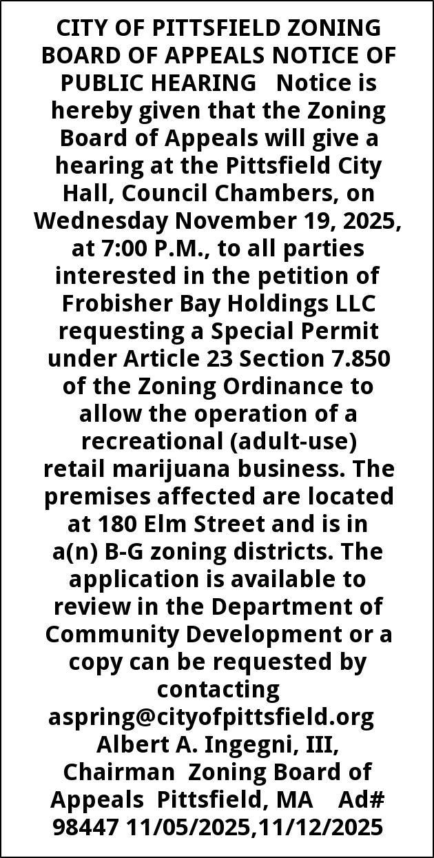 CITY OF PITTSFIELD ZONING BOARD OF APPEALS NOTICE OF PUBLIC HEARING Notice is hereby given that the Zoning Board of Appeals will give a hearing at the Pittsfield City Hall, Council Chambers, on Wednesday November 19, 2025, at 7:00 P.M., to all parties interested in the petition of Frobisher Bay Holdings LLC requesting a Special Permit under Article 23 Section 7.850 of the Zoning Ordinance to allow the operation of a recreational (adult-use) retail marijuana business. The premises affected are located at 180 Elm Street and is in a(n) B-G zoning districts. The application is available to review in the Department of Community Development or a copy can be requested by contacting aspring@cityofpittsfield.org Albert A. Ingegni, III, Chairman Zoning Board of Appeals Pittsfield, MA Ad# 98447 11/05/2025,11/12/2025