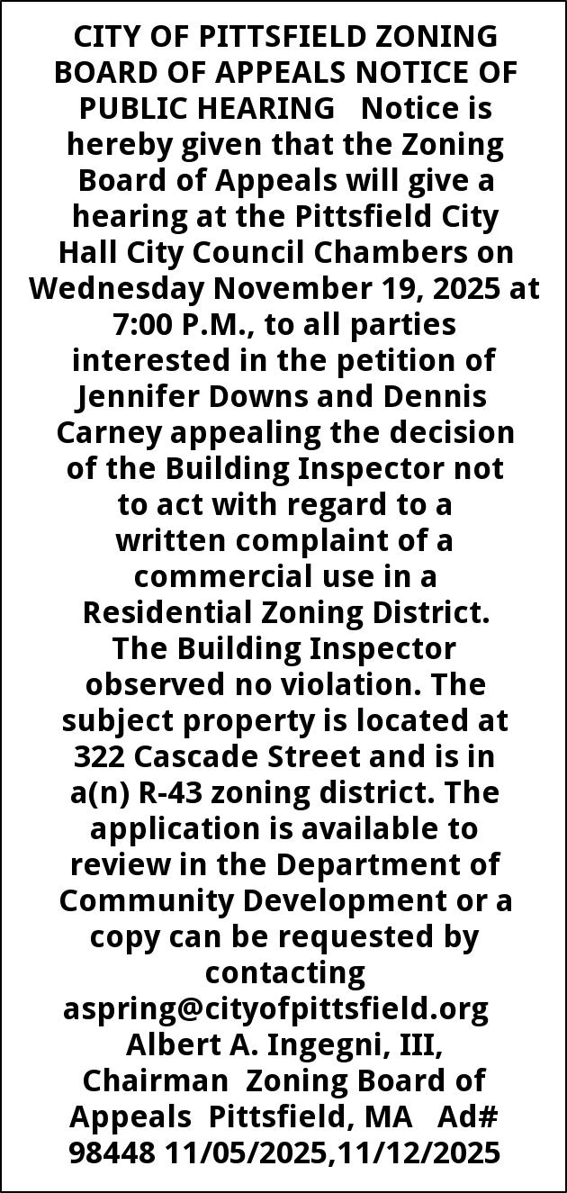 CITY OF PITTSFIELD ZONING BOARD OF APPEALS NOTICE OF PUBLIC HEARING Notice is hereby given that the Zoning Board of Appeals will give a hearing at the Pittsfield City Hall City Council Chambers on Wednesday November 19, 2025 at 7:00 P.M., to all parties interested in the petition of Jennifer Downs and Dennis Carney appealing the decision of the Building Inspector not to act with regard to a written complaint of a commercial use in a Residential Zoning District. The Building Inspector observed no violation. The subject property is located at 322 Cascade Street and is in a(n) R-43 zoning district. The application is available to review in the Department of Community Development or a copy can be requested by contacting aspring@cityofpittsfield.org Albert A. Ingegni, III, Chairman Zoning Board of Appeals Pittsfield, MA Ad# 98448 11/05/2025,11/12/2025