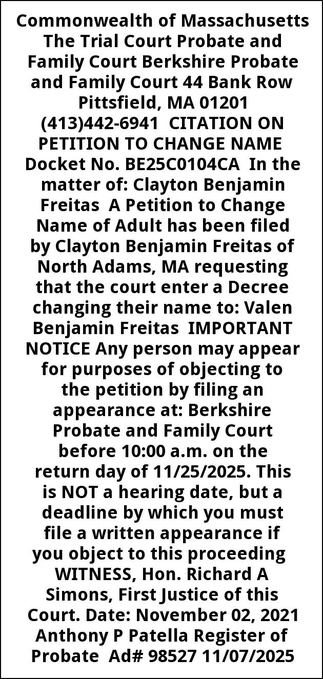 Commonwealth of Massachusetts The Trial Court Probate and Family Court Berkshire Probate and Family Court 44 Bank Row Pittsfield, MA 01201 (413)442-6941 CITATION ON PETITION TO CHANGE NAME Docket No. BE25C0104CA In the matter of: Clayton Benjamin Freitas A Petition to Change Name of Adult has been filed by Clayton Benjamin Freitas of North Adams, MA requesting that the court enter a Decree changing their name to: Valen Benjamin Freitas IMPORTANT NOTICE Any person may appear for purposes of objecting to the petition by filing an appearance at: Berkshire Probate and Family Court before 10:00 a.m. on the return day of 11/25/2025. This is NOT a hearing date, but a deadline by which you must file a written appearance if you object to this proceeding WITNESS, Hon. Richard A Simons, First Justice of this Court. Date: November 02, 2021 Anthony P Patella Register of Probate Ad# 98527 11/07/2025