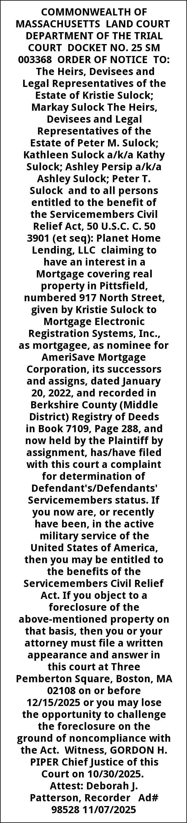 COMMONWEALTH OF MASSACHUSETTS LAND COURT DEPARTMENT OF THE TRIAL COURT DOCKET NO. 25 SM 003368 ORDER OF NOTICE TO: The Heirs, Devisees and Legal Representatives of the Estate of Kristie Sulock; Markay Sulock The Heirs, Devisees and Legal Representatives of the Estate of Peter M. Sulock; Kathleen Sulock a/k/a Kathy Sulock; Ashley Persip a/k/a Ashley Sulock; Peter T. Sulock and to all persons entitled to the benefit of the Servicemembers Civil Relief Act, 50 U.S.C. C. 50 3901 (et seq): Planet Home Lending, LLC claiming to have an interest in a Mortgage covering real property in Pittsfield, numbered 917 North Street, given by Kristie Sulock to Mortgage Electronic Registration Systems, Inc., as mortgagee, as nominee for AmeriSave Mortgage Corporation, its successors and assigns, dated January 20, 2022, and recorded in Berkshire County (Middle District) Registry of Deeds in Book 7109, Page 288, and now held by the Plaintiff by assignment, has/have filed with this court a complaint for determination of Defendant's/Defendants' Servicemembers status. If you now are, or recently have been, in the active military service of the United States of America, then you may be entitled to the benefits of the Servicemembers Civil Relief Act. If you object to a foreclosure of the above-mentioned property on that basis, then you or your attorney must file a written appearance and answer in this court at Three Pemberton Square, Boston, MA 02108 on or before 12/15/2025 or you may lose the opportunity to challenge the foreclosure on the ground of noncompliance with the Act. Witness, GORDON H. PIPER Chief Justice of this Court on 10/30/2025. Attest: Deborah J. Patterson, Recorder Ad# 98528 11/07/2025