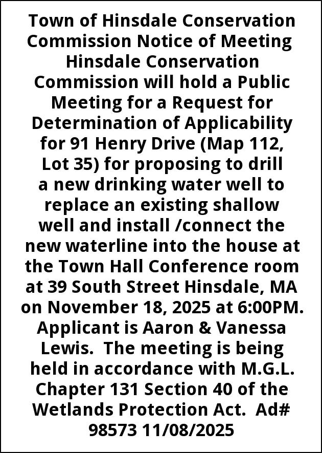 Town of Hinsdale Conservation Commission Notice of Meeting Hinsdale Conservation Commission will hold a Public Meeting for a Request for Determination of Applicability for 91 Henry Drive (Map 112, Lot 35) for proposing to drill a new drinking water well to replace an existing shallow well and install /connect the new waterline into the house at the Town Hall Conference room at 39 South Street Hinsdale, MA on November 18, 2025 at 6:00PM. Applicant is Aaron & Vanessa Lewis. The meeting is being held in accordance with M.G.L. Chapter 131 Section 40 of the Wetlands Protection Act. Ad# 98573 11/08/2025