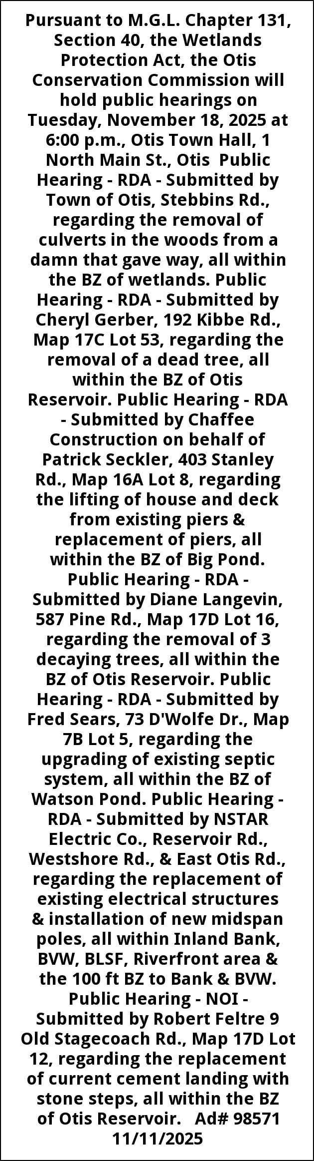 Pursuant to M.G.L. Chapter 131, Section 40, the Wetlands Protection Act, the Otis Conservation Commission will hold public hearings on Tuesday, November 18, 2025 at 6:00 p.m., Otis Town Hall, 1 North Main St., Otis Public Hearing - RDA - Submitted by Town of Otis, Stebbins Rd., regarding the removal of culverts in the woods from a damn that gave way, all within the BZ of wetlands. Public Hearing - RDA - Submitted by Cheryl Gerber, 192 Kibbe Rd., Map 17C Lot 53, regarding the removal of a dead tree, all within the BZ of Otis Reservoir. Public Hearing - RDA - Submitted by Chaffee Construction on behalf of Patrick Seckler, 403 Stanley Rd., Map 16A Lot 8, regarding the lifting of house and deck from existing piers & replacement of piers, all within the BZ of Big Pond. Public Hearing - RDA - Submitted by Diane Langevin, 587 Pine Rd., Map 17D Lot 16, regarding the removal of 3 decaying trees, all within the BZ of Otis Reservoir. Public Hearing - RDA - Submitted by Fred Sears, 73 D'Wolfe Dr., Map 7B Lot 5, regarding the upgrading of existing septic system, all within the BZ of Watson Pond. Public Hearing - RDA - Submitted by NSTAR Electric Co., Reservoir Rd., Westshore Rd., & East Otis Rd., regarding the replacement of existing electrical structures & installation of new midspan poles, all within Inland Bank, BVW, BLSF, Riverfront area & the 100 ft BZ to Bank & BVW. Public Hearing - NOI - Submitted by Robert Feltre 9 Old Stagecoach Rd., Map 17D Lot 12, regarding the replacement of current cement landing with stone steps, all within the BZ of Otis Reservoir. Ad# 98571 11/11/2025