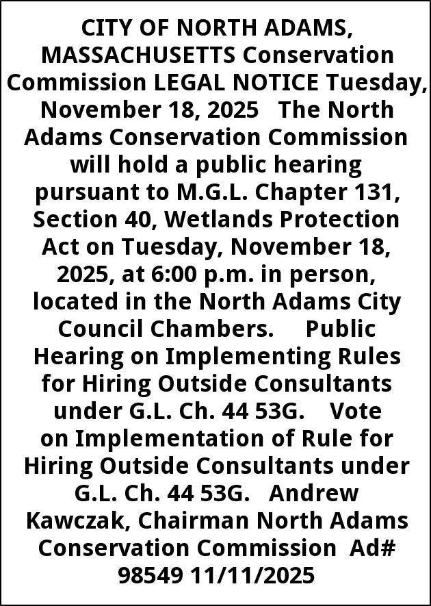 CITY OF NORTH ADAMS, MASSACHUSETTS Conservation Commission LEGAL NOTICE Tuesday, November 18, 2025 The North Adams Conservation Commission will hold a public hearing pursuant to M.G.L. Chapter 131, Section 40, Wetlands Protection Act on Tuesday, November 18, 2025, at 6:00 p.m. in person, located in the North Adams City Council Chambers. Public Hearing on Implementing Rules for Hiring Outside Consultants under G.L. Ch. 44 53G. Vote on Implementation of Rule for Hiring Outside Consultants under G.L. Ch. 44 53G. Andrew Kawczak, Chairman North Adams Conservation Commission Ad# 98549 11/11/2025