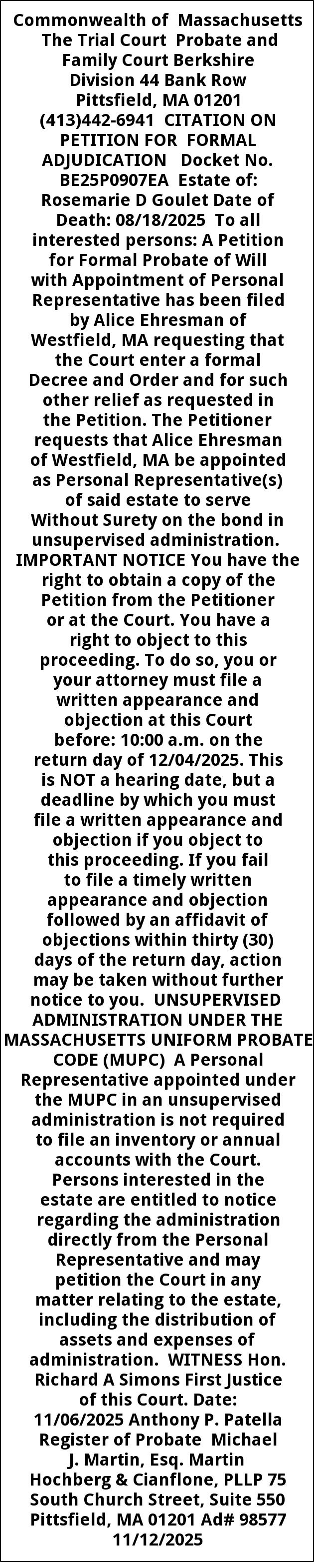 Commonwealth of Massachusetts The Trial Court Probate and Family Court Berkshire Division 44 Bank Row Pittsfield, MA 01201 (413)442-6941 CITATION ON PETITION FOR FORMAL ADJUDICATION Docket No. BE25P0907EA Estate of: Rosemarie D Goulet Date of Death: 08/18/2025 To all interested persons: A Petition for Formal Probate of Will with Appointment of Personal Representative has been filed by Alice Ehresman of Westfield, MA requesting that the Court enter a formal Decree and Order and for such other relief as requested in the Petition. The Petitioner requests that Alice Ehresman of Westfield, MA be appointed as Personal Representative(s) of said estate to serve Without Surety on the bond in unsupervised administration. IMPORTANT NOTICE You have the right to obtain a copy of the Petition from the Petitioner or at the Court. You have a right to object to this proceeding. To do so, you or your attorney must file a written appearance and objection at this Court before: 10:00 a.m. on the return day of 12/04/2025. This is NOT a hearing date, but a deadline by which you must file a written appearance and objection if you object to this proceeding. If you fail to file a timely written appearance and objection followed by an affidavit of objections within thirty (30) days of the return day, action may be taken without further notice to you. UNSUPERVISED ADMINISTRATION UNDER THE MASSACHUSETTS UNIFORM PROBATE CODE (MUPC) A Personal Representative appointed under the MUPC in an unsupervised administration is not required to file an inventory or annual accounts with the Court. Persons interested in the estate are entitled to notice regarding the administration directly from the Personal Representative and may petition the Court in any matter relating to the estate, including the distribution of assets and expenses of administration. WITNESS Hon. Richard A Simons First Justice of this Court. Date: 11/06/2025 Anthony P. Patella Register of Probate Michael J. Martin, Esq. Martin Hochberg & Cianflone, PLLP 75 South Church Street, Suite 550 Pittsfield, MA 01201 Ad# 98577 11/12/2025