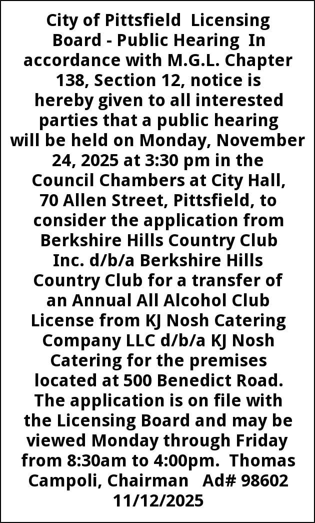 City of Pittsfield Licensing Board - Public Hearing In accordance with M.G.L. Chapter 138, Section 12, notice is hereby given to all interested parties that a public hearing will be held on Monday, November 24, 2025 at 3:30 pm in the Council Chambers at City Hall, 70 Allen Street, Pittsfield, to consider the application from Berkshire Hills Country Club Inc. d/b/a Berkshire Hills Country Club for a transfer of an Annual All Alcohol Club License from KJ Nosh Catering Company LLC d/b/a KJ Nosh Catering for the premises located at 500 Benedict Road. The application is on file with the Licensing Board and may be viewed Monday through Friday from 8:30am to 4:00pm. Thomas Campoli, Chairman Ad# 98602 11/12/2025