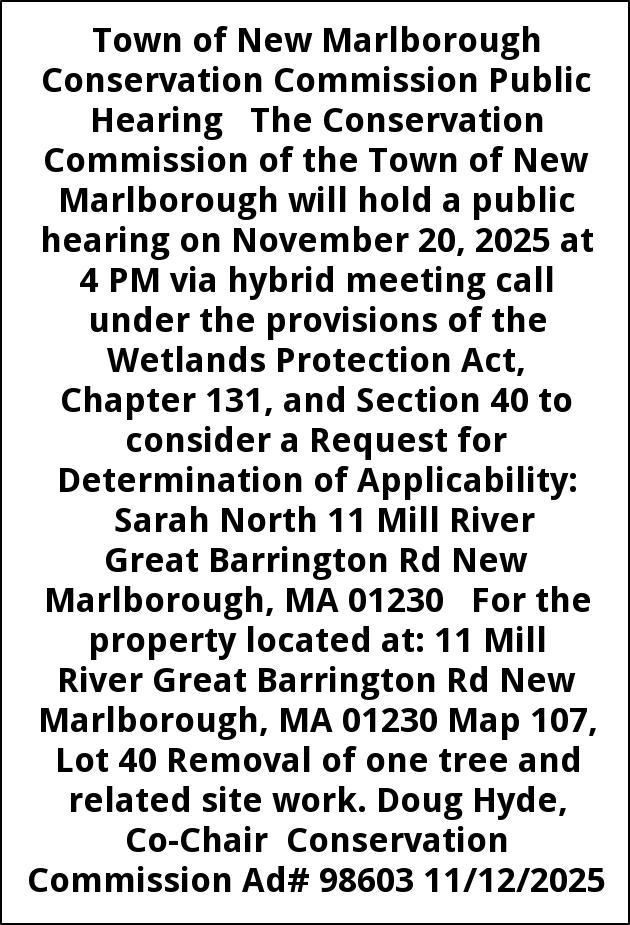 Town of New Marlborough Conservation Commission Public Hearing The Conservation Commission of the Town of New Marlborough will hold a public hearing on November 20, 2025 at 4 PM via hybrid meeting call under the provisions of the Wetlands Protection Act, Chapter 131, and Section 40 to consider a Request for Determination of Applicability: Sarah North 11 Mill River Great Barrington Rd New Marlborough, MA 01230 For the property located at: 11 Mill River Great Barrington Rd New Marlborough, MA 01230 Map 107, Lot 40 Removal of one tree and related site work. Doug Hyde, Co-Chair Conservation Commission Ad# 98603 11/12/2025
