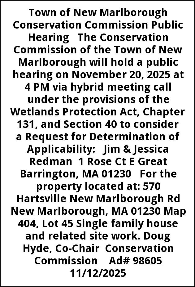 Town of New Marlborough Conservation Commission Public Hearing The Conservation Commission of the Town of New Marlborough will hold a public hearing on November 20, 2025 at 4 PM via hybrid meeting call under the provisions of the Wetlands Protection Act, Chapter 131, and Section 40 to consider a Request for Determination of Applicability: Jim & Jessica Redman 1 Rose Ct E Great Barrington, MA 01230 For the property located at: 570 Hartsville New Marlborough Rd New Marlborough, MA 01230 Map 404, Lot 45 Single family house and related site work. Doug Hyde, Co-Chair Conservation Commission Ad# 98605 11/12/2025
