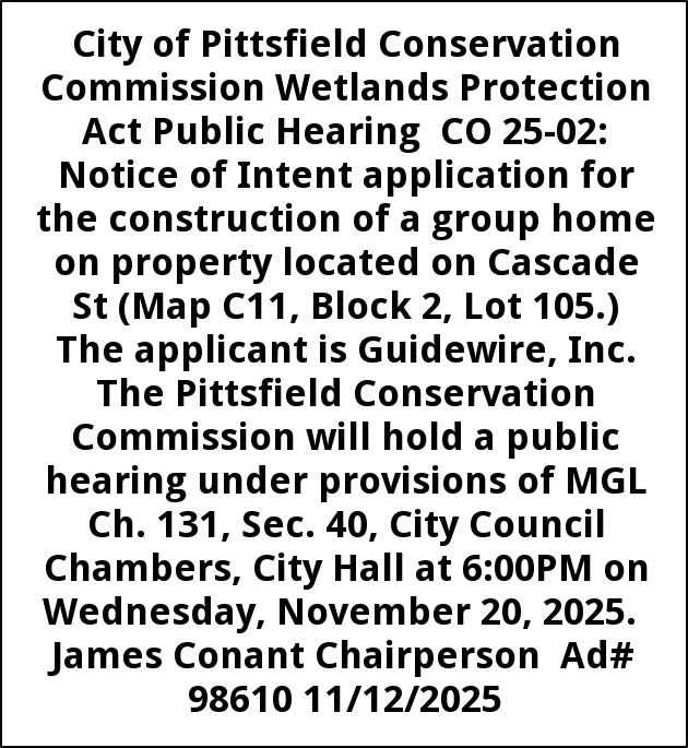 City of Pittsfield Conservation Commission Wetlands Protection Act Public Hearing CO 25-02: Notice of Intent application for the construction of a group home on property located on Cascade St (Map C11, Block 2, Lot 105.) The applicant is Guidewire, Inc. The Pittsfield Conservation Commission will hold a public hearing under provisions of MGL Ch. 131, Sec. 40, City Council Chambers, City Hall at 6:00PM on Wednesday, November 20, 2025. James Conant Chairperson Ad# 98610 11/12/2025