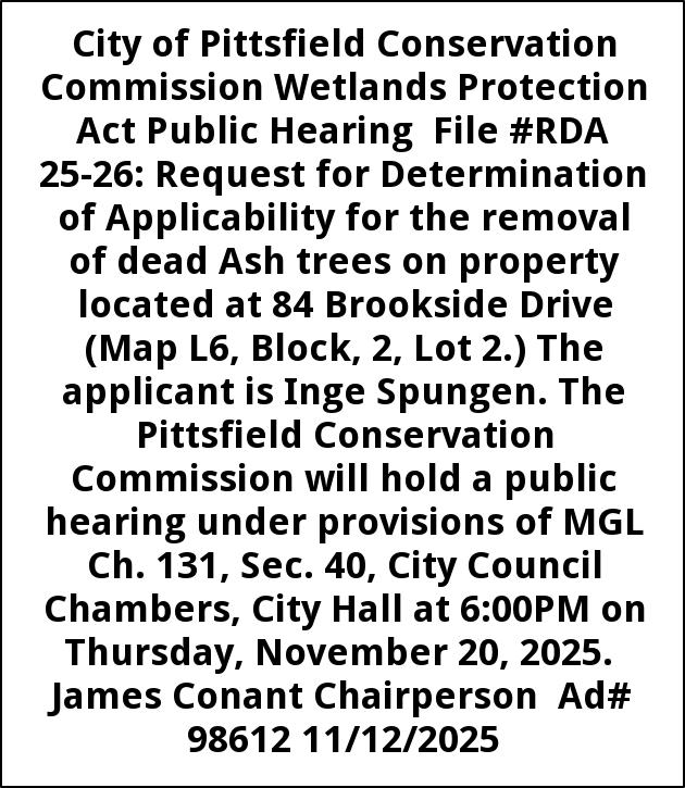 City of Pittsfield Conservation Commission Wetlands Protection Act Public Hearing File #RDA 25-26: Request for Determination of Applicability for the removal of dead Ash trees on property located at 84 Brookside Drive (Map L6, Block, 2, Lot 2.) The applicant is Inge Spungen. The Pittsfield Conservation Commission will hold a public hearing under provisions of MGL Ch. 131, Sec. 40, City Council Chambers, City Hall at 6:00PM on Thursday, November 20, 2025. James Conant Chairperson Ad# 98612 11/12/2025