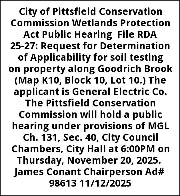 City of Pittsfield Conservation Commission Wetlands Protection Act Public Hearing File RDA 25-27: Request for Determination of Applicability for soil testing on property along Goodrich Brook (Map K10, Block 10, Lot 10.) The applicant is General Electric Co. The Pittsfield Conservation Commission will hold a public hearing under provisions of MGL Ch. 131, Sec. 40, City Council Chambers, City Hall at 6:00PM on Thursday, November 20, 2025. James Conant Chairperson Ad# 98613 11/12/2025