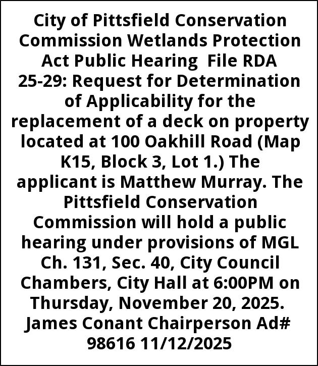 City of Pittsfield Conservation Commission Wetlands Protection Act Public Hearing File RDA 25-29: Request for Determination of Applicability for the replacement of a deck on property located at 100 Oakhill Road (Map K15, Block 3, Lot 1.) The applicant is Matthew Murray. The Pittsfield Conservation Commission will hold a public hearing under provisions of MGL Ch. 131, Sec. 40, City Council Chambers, City Hall at 6:00PM on Thursday, November 20, 2025. James Conant Chairperson Ad# 98616 11/12/2025